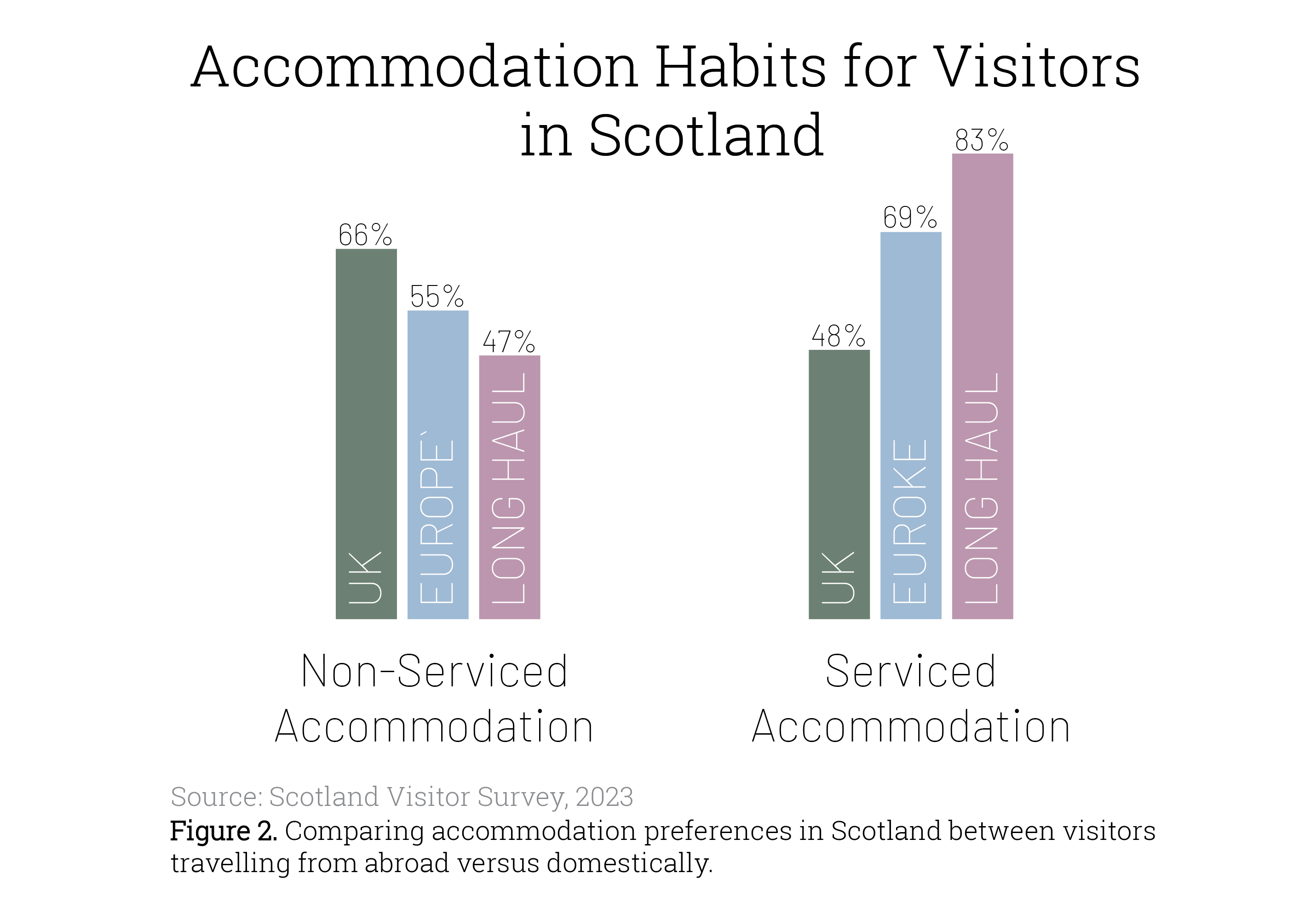 While international tourists typically gravitate toward urban areas like Edinburgh and Glasgow, their preference for hotel-style accommodations, shown in Figure 2, and large-scale infrastructure means that remote regions in the Highlands often miss out on this high-volume, large-scale tourism. However, many of these rural areas may not actively seek such attention, as large-scale tourism can bring both benefits and challenges. Increased numbers of visitors could place strain on local resources, disrupt quiet communities, and even impact the natural environment, which many rural destinations in the Highlands strive to preserve.