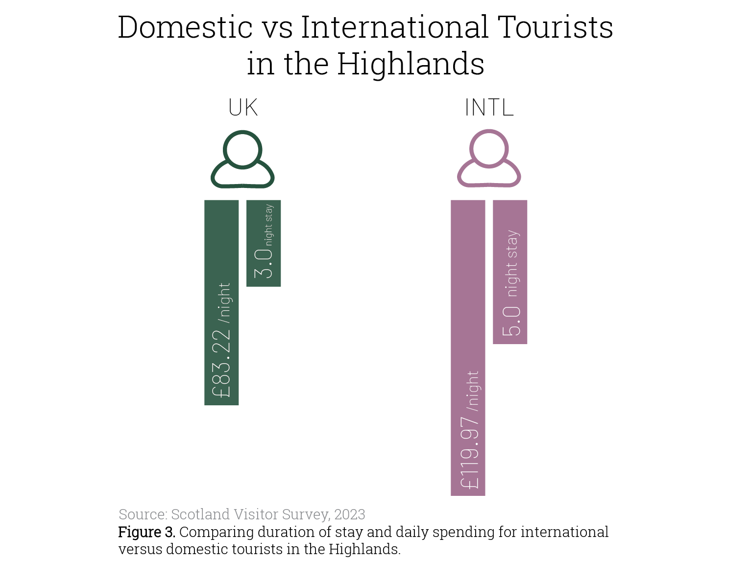 In the Highlands, as shown in Figure 3, the average International tourist spends 30% more than the domestic traveller per night. Although there are 3.5 times more domestic tourists that visit the Highlands every year, International tourists tend to stay longer and spend more per visit.