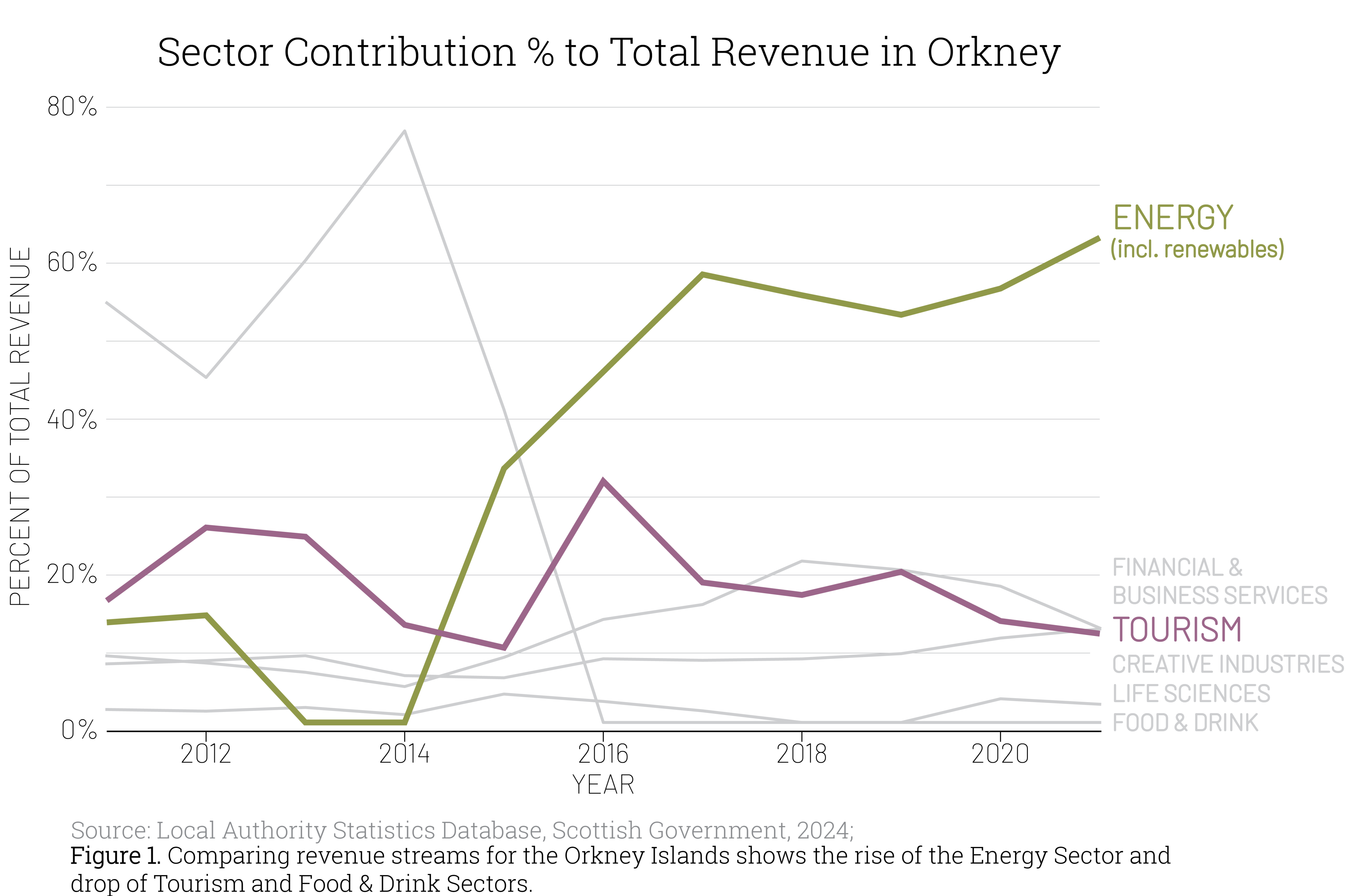 Orkney's concerning decline in tourism revenue has prompted the need to rely on and invest in other sectors. Figure 1 illustrates the latest revenue trends for the region, revealing that while the Food & Drink and Tourism sectors have reduced their contributions, the Energy sector has seen substantial growth since 2014, emerging as Orkney's new primary economic driver. Historically, agriculture and fishing were the dominant industries. With energy now at the forefront, this transition suggests that the sector may offer a more stable and economically sustainable future for the islands.