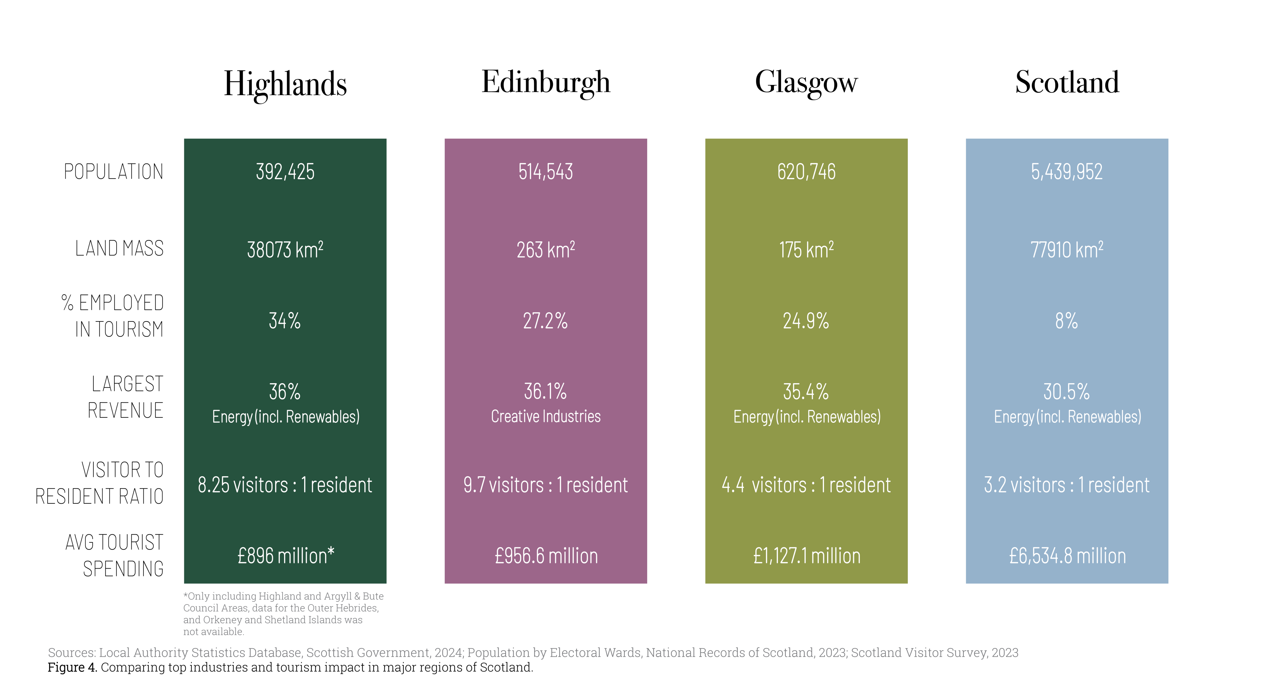 Additionally, while the two cities are much more densely populated, the Highlands sees a similar visitor-to-resident ratio to that of Edinburgh (fig. 4), accentuating the immense tourist appeal of the region's natural attractions. Edinburgh, with its extensive infrastructure, is better equipped to handle both its dense population and a high influx of tourists. The Highlands, in contrast, face significant infrastructure limitations. This high tourist density, relative to its population, highlights the economic opportunity and pressure tourism brings to the Highlands, emphasizing the need for sustainable development to support this demand without overwhelming local resources.